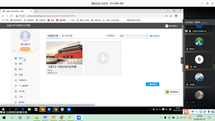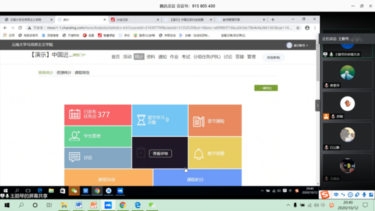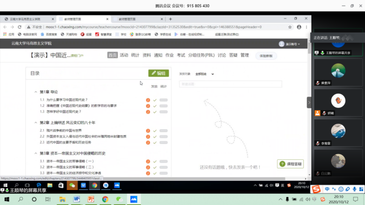 10月12日,马克思主义基本原理概论教研室全体成员通过腾讯会议举行了第五次集体备课会。本次会议邀请超星学习通的老师进行线上培训,为马克思主义主义基本原理概论、思想道德修养与法律基础两个教研室的老师提供了超星学习通的使用方法、操作步骤等方面的指导和答疑。