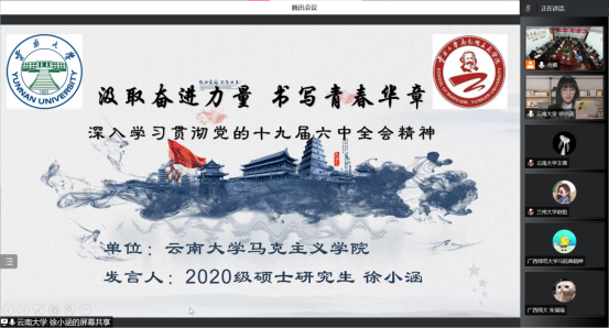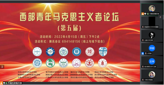 2022年4月15日下午两点,best365网页版登录受邀参加第五届西部青年马克思主义者论坛。此次论坛以“昂首奋进新征程青春礼赞展风华——深入学习贯彻党的十九届六中全会精神”为主题,来自兰州大学、四川大学、陕西师范大学、电子科技大学等12所高校best365网页版登录的200多名研究生相聚云端,共同交流学习党的十九届六中全会精神。公司2020级硕士研究生徐小涵在论坛上作交流发言。
